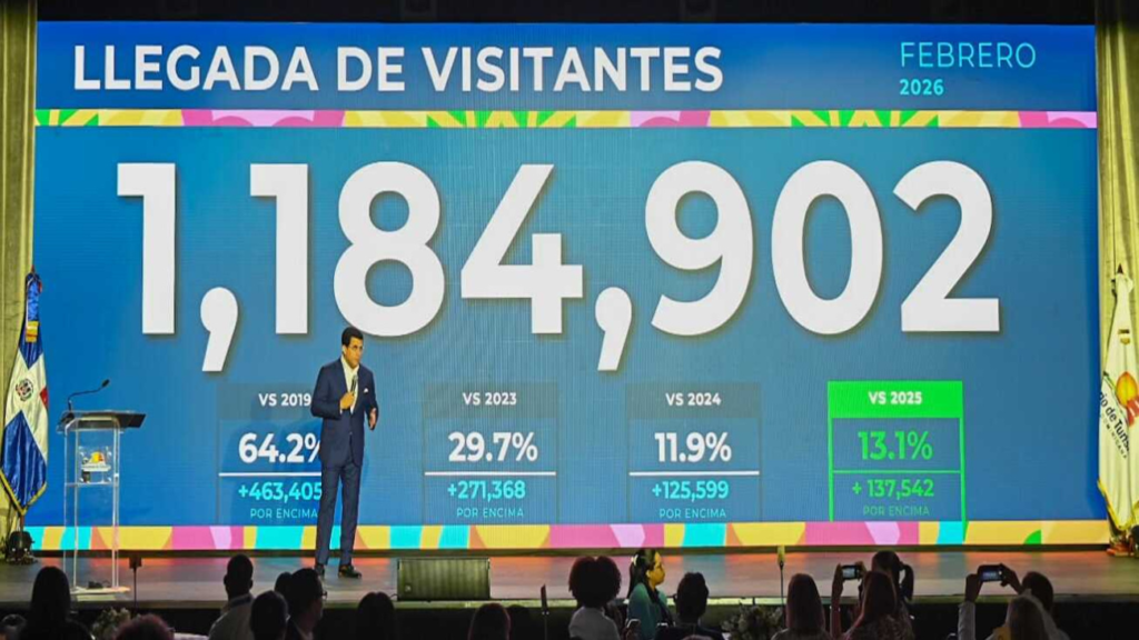Dijo que la llegada de 1,184,902 en febrero, representa un crecimiento de un 13.1 % comparado con el mismo mes del 2025, un 11.9 % respecto al 2024 y un 64.2 % frente al 2019.